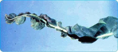 La început, simptomele apar la frunzele tinere, care se clorozează local şi prezintă leziuni necrotice de-a lungul nervurilor principale. Limbul foliar este micşorat, răsucit în jurul nervurii centrale, cu marginile ridicate şi ondulate. Intervine şi o secreţie maronie, lipicioasă, pe limb şi nervuri.
